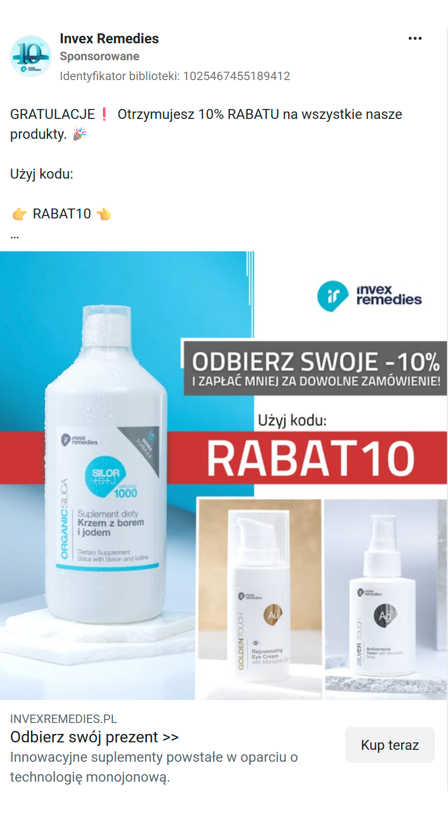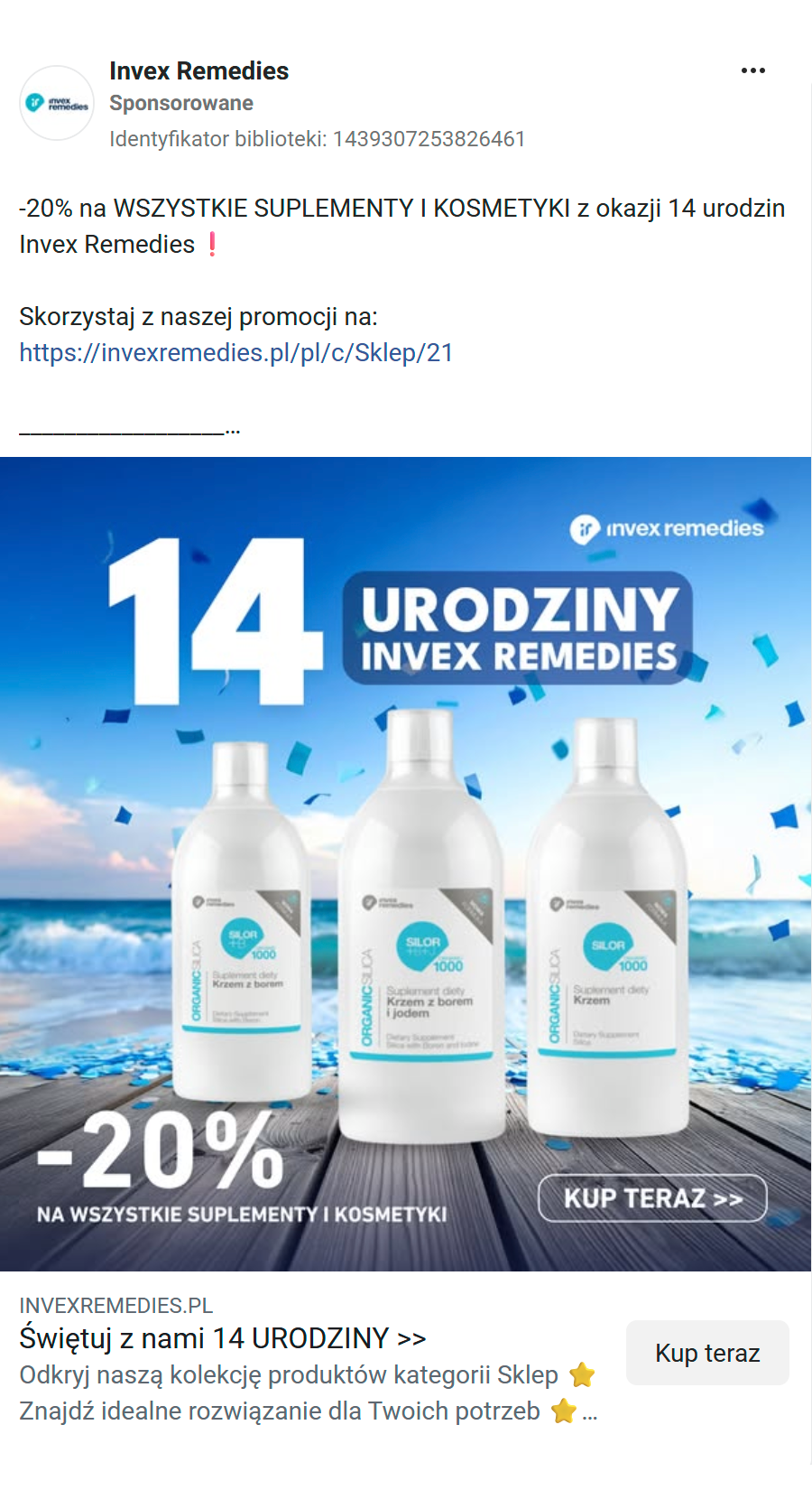 Poza okresami intensywnych promocji nie wyłączaliśmy działań całkowicie. Nadal prowadziliśmy działania mające na celu generowanie sprzedaży w sklepie oraz utrzymanie stałej widoczności. Równolegle regularnie promowaliśmy posty edukacyjne z fanpage'a, aby konsekwentnie budować autorytet i wspierać wizerunek marki Invex Remedies.