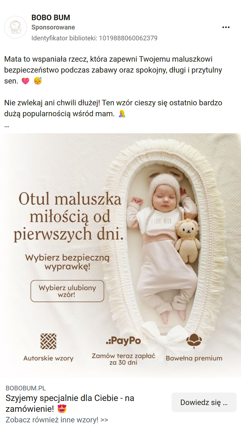 Opierając się na bogatym doświadczeniu w branży e-commerce i sukcesach w prowadzeniu licznych sklepów internetowych, nasza ekspertka ds. Meta Ads, strategicznie skoncentrowała komunikację reklamową na promocji bestsellerowych wyprawek.