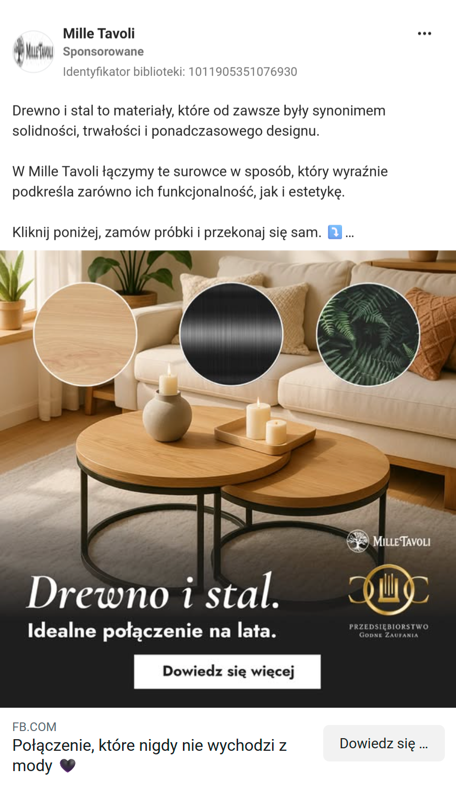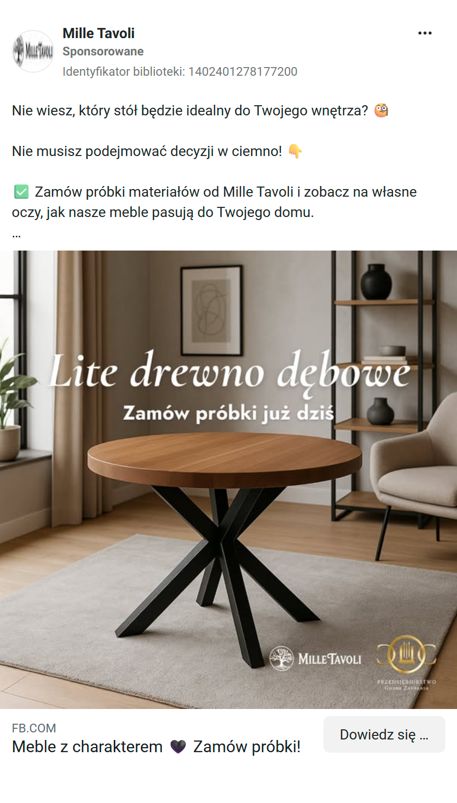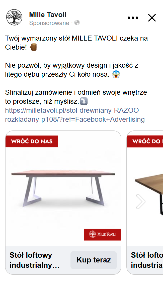 Reklamy kierowane do nowych odbiorców prezentowały design stołów i charakter marki, zachęcając do pierwszej wizyty na stronie. Ważnym elementem były także kreacje promujące zamówienie próbki blatu - jasny, prosty krok, który pozwala klientowi poznać produkt bez dużego zaangażowania. Ten komunikat idealnie wpisywał się w sposób, w jaki klienci Mille Tavoli podejmują decyzje.
