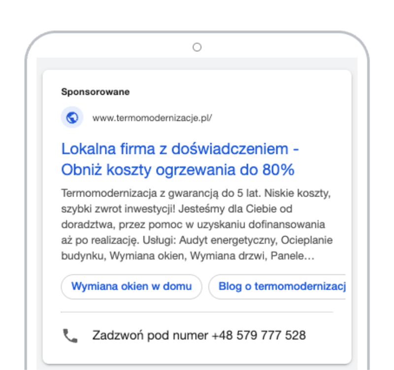 Równolegle uruchomiliśmy kampanie w sieci wyszukiwania Google. Kluczowym momentem była analiza konwersji wykonana przez specjalistę Google Ads, która ujawniła, że kontakty telefoniczne są nie tylko tańsze w pozyskaniu (nawet 12-krotnie!), ale przede wszystkim przekładają się na umowy sprzedażowe i generują wielokrotnie wyższą wartość biznesową niż zapytania z formularzy.