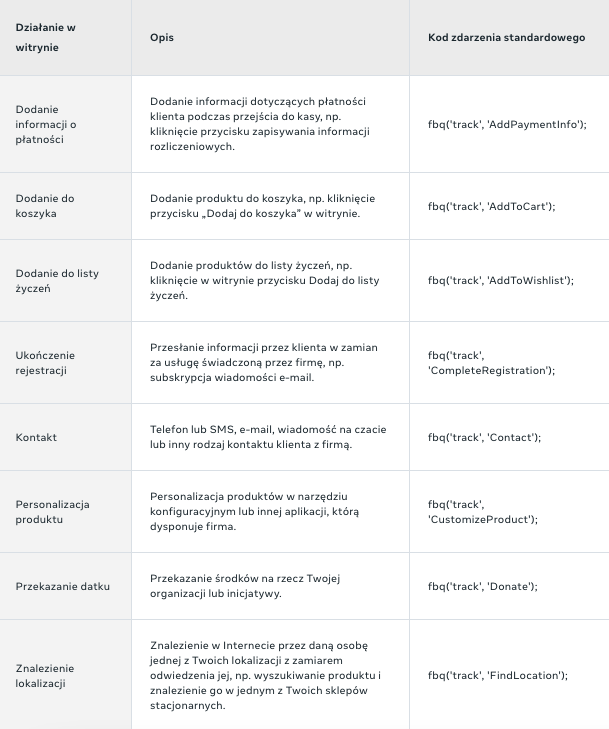Oto opisy i kody standardowych zdarzeń ze strony Facebooka: