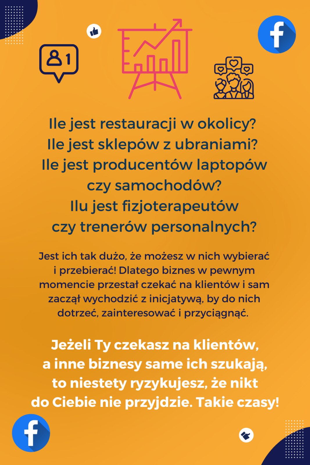Obecnie Facebook jest jednym z najlepszych narzędzi wyjścia do klientów i pokazania im swojego biznesu. Dlaczego jest to istotne? Zobacz. Kiedyś krawiec, bankier czy właściciel restauracji otwierał lokal i czekał, aż klient do niego przyjdzie. A ponieważ nie było w okolicy konkurencji, to ludzie faktycznie przychodzili.